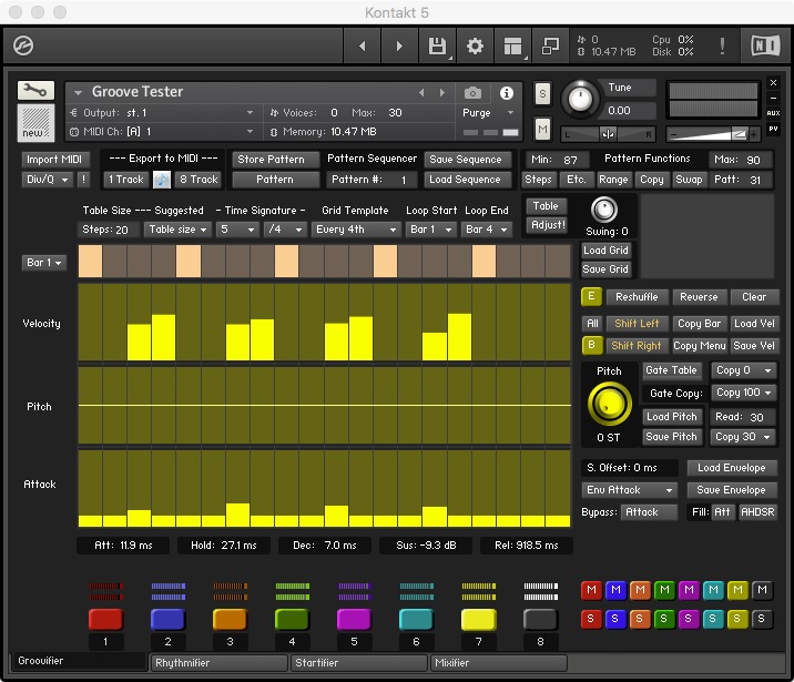 The Groovifier is a Kontakt 5/6 instrument. It is essentially an eight-part rhythm machine with a pattern sequencer. Each pattern of the Groovifier can play up to 32 different sounds (that's four sounds per part). The Groovifier stores 100 distinct patterns, and it can play back a 200-pattern sequence. Each pattern can be up to four bars long.